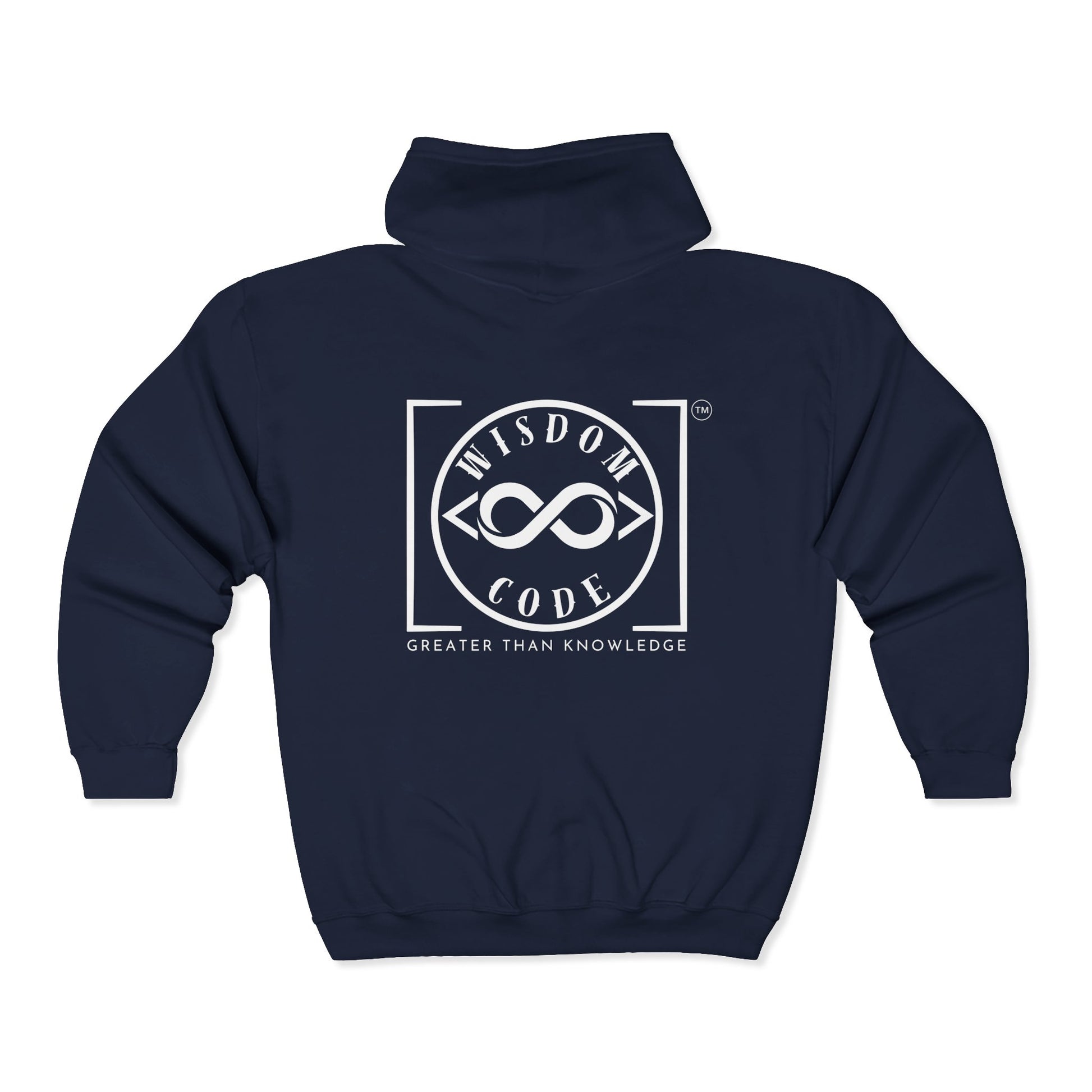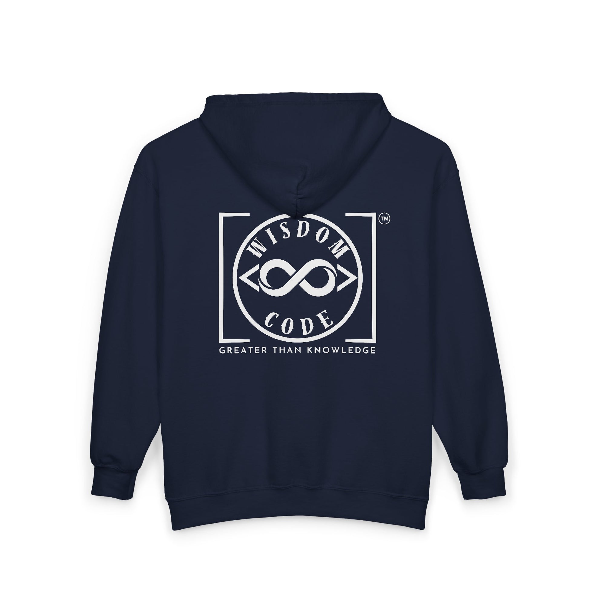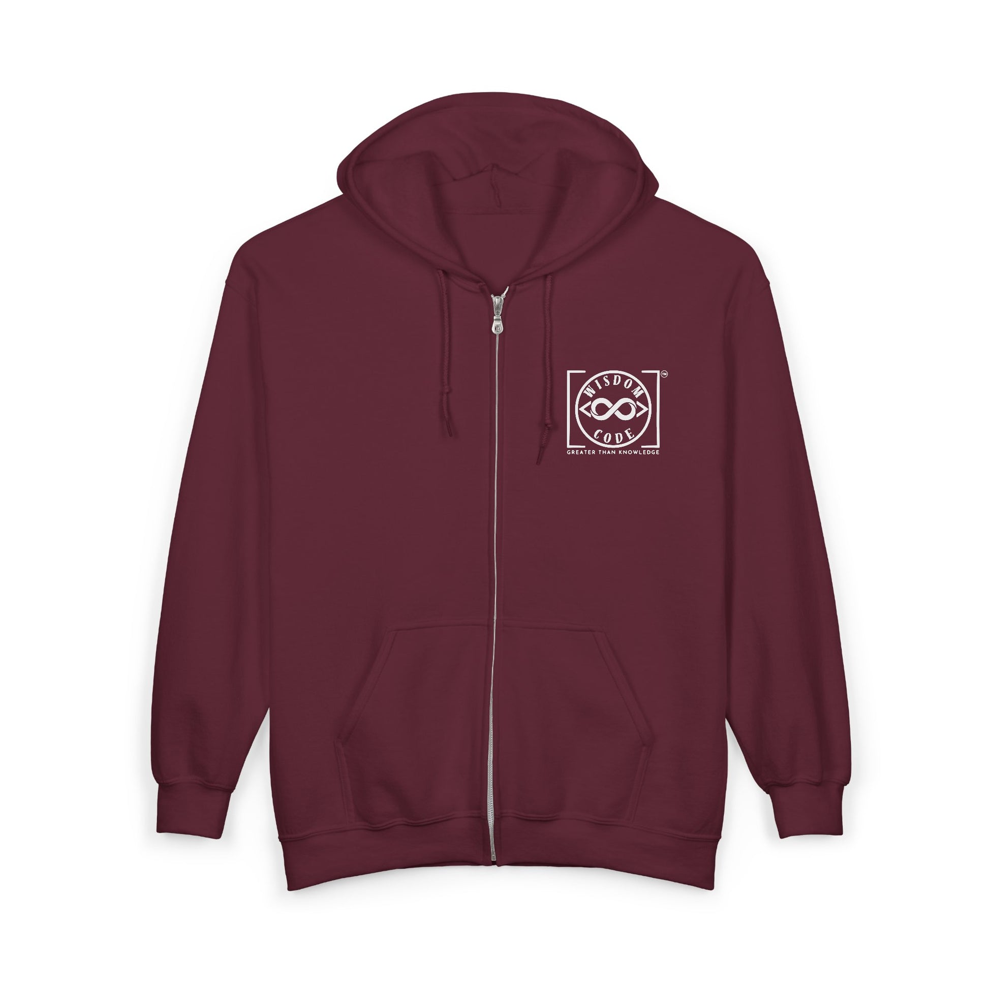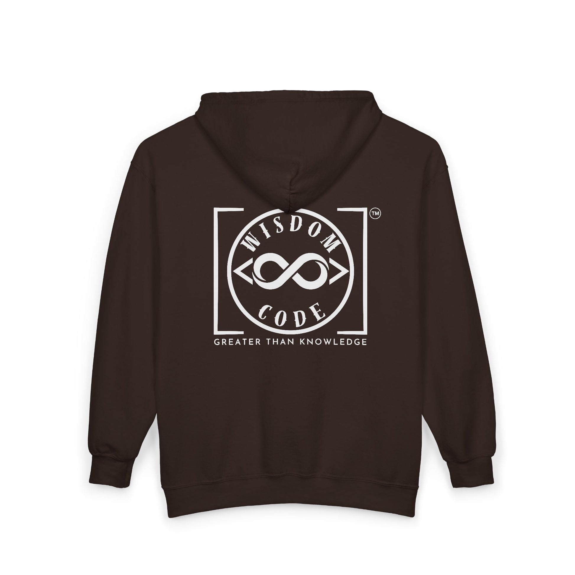 Cozy Unisex Zip-Up Hoodie, perfect for casual style in all seasons. Ideal as a gift for friends and family. Comfortable layering piece featuring the new trending brand 'Wisdom Code'. Relevant for adults looking for a stylish and cozy sweatshirt. Perfect for holidays, birthdays, and special occasions.