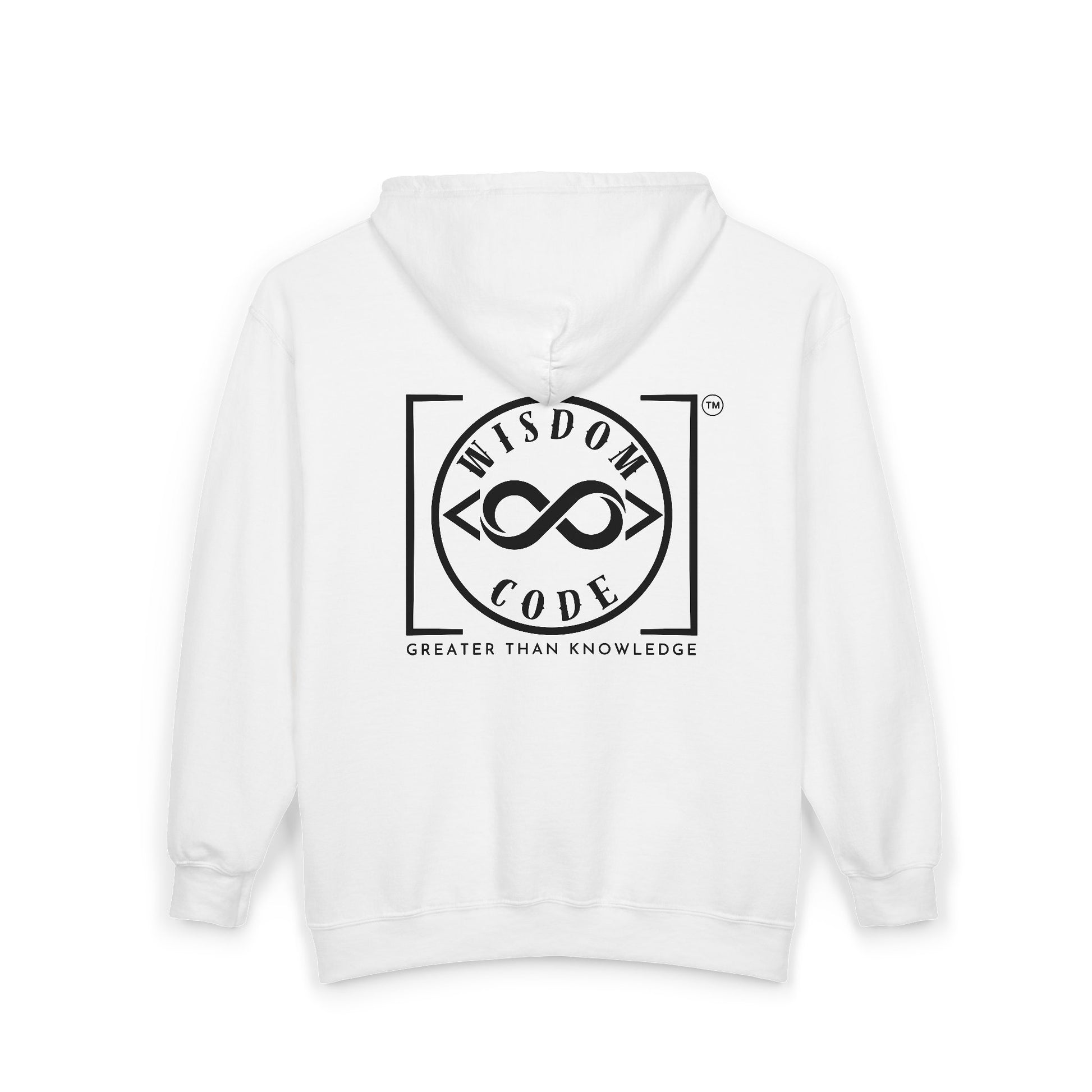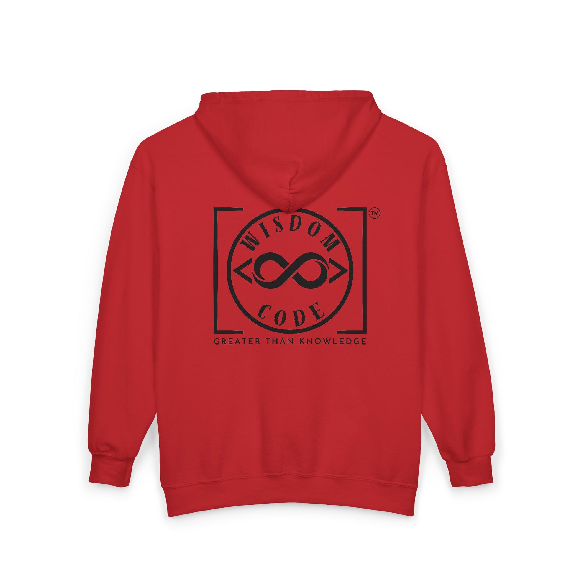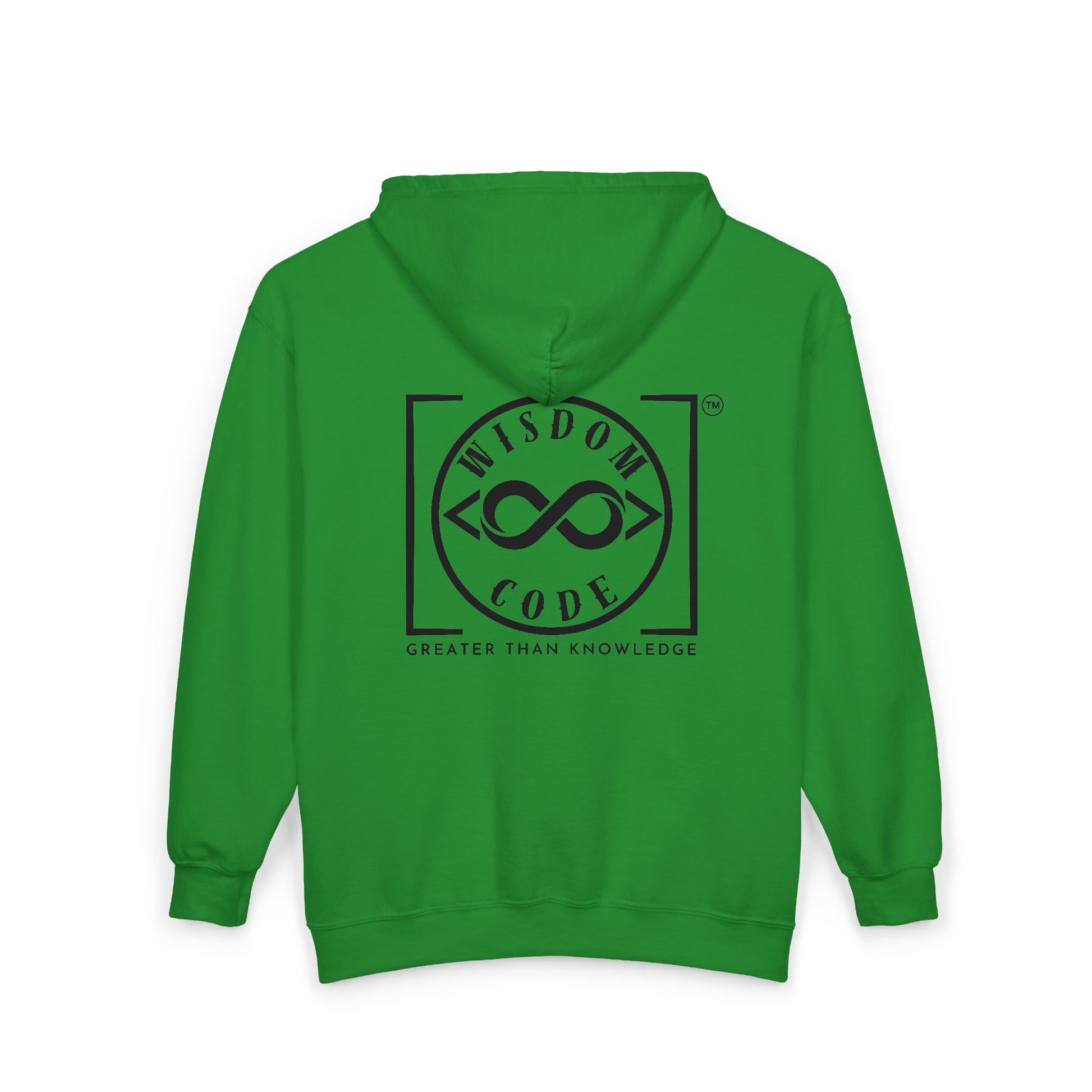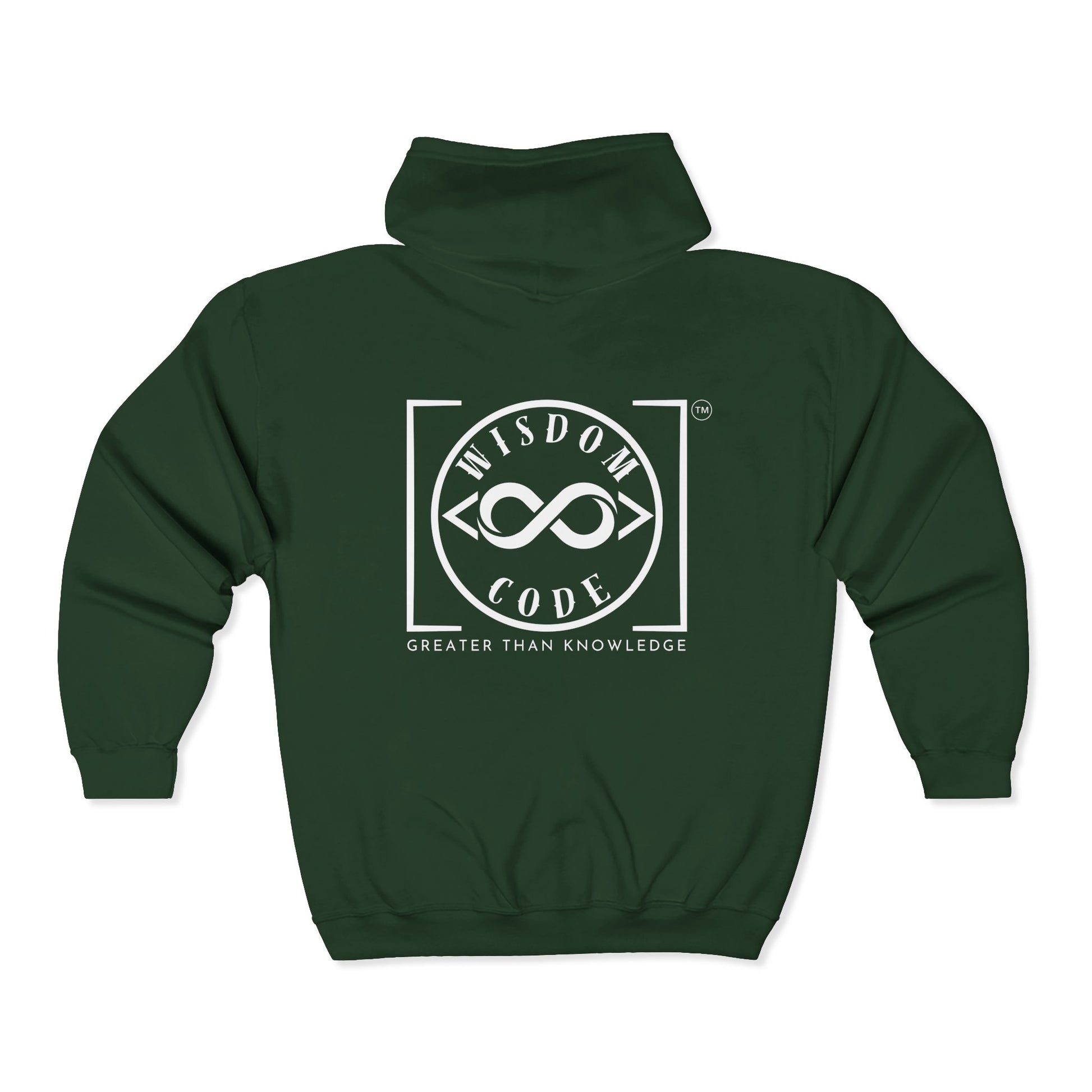 Cozy Unisex Zip-Up Hoodie, perfect for casual style in all seasons. Ideal as a gift for friends and family. Comfortable layering piece featuring the new trending brand 'Wisdom Code'. Relevant for adults looking for a stylish and cozy sweatshirt. Perfect for holidays, birthdays, and special occasions.
